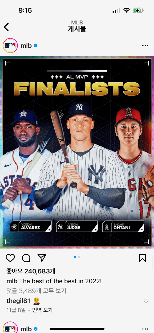 2022년 메이저리그MLB 양대리그 MVP후보가 등장했다. 바로 DH 요르단 알바레즈, OF 애런 저지, SP & DH 오타니 쇼헤이이다. 요르단 알바레즈가 못한 것은 아니지만, 오타니 쇼헤이의 타격부문에서 앞서지만, 오타니 쇼헤이는 투수라는 점이다. 투수이면서도 타자라는 점이다. 오타니는 15승 9패의 성적과 방어율 2.33을 기록했고, 166이닝동안 삼진을 219개를 잡아냈다. 정말 만화영화에서나 볼 수 있는 캐릭터이다. 하지만, 오타니 쇼헤이의 성적도 성적이지만, 올해는 애런 저지가 너무 괴물같은 성적을 내버려서 오타니 쇼헤이도 MVP수상의 꿈은 올해 접어야 하지 않겠나 싶다.