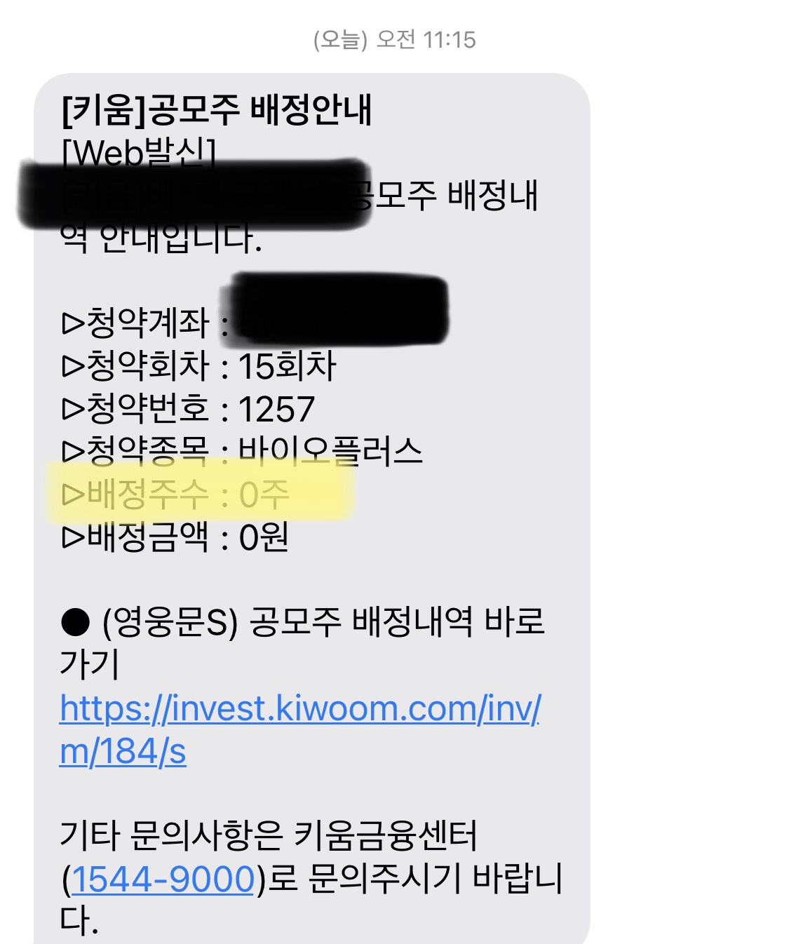 마지막으로, 키움증권이 주관한 공모주 <바이오플러스>는 1주라도 받았음 좋았을텐데, 이번에는 콰콰콰콰….꽝이 나와버렸습니다ㅜㅜ 공모주 청약하고 첨으로 ‘꽝’이 나왔네요. 이럴 수도 있군요.
