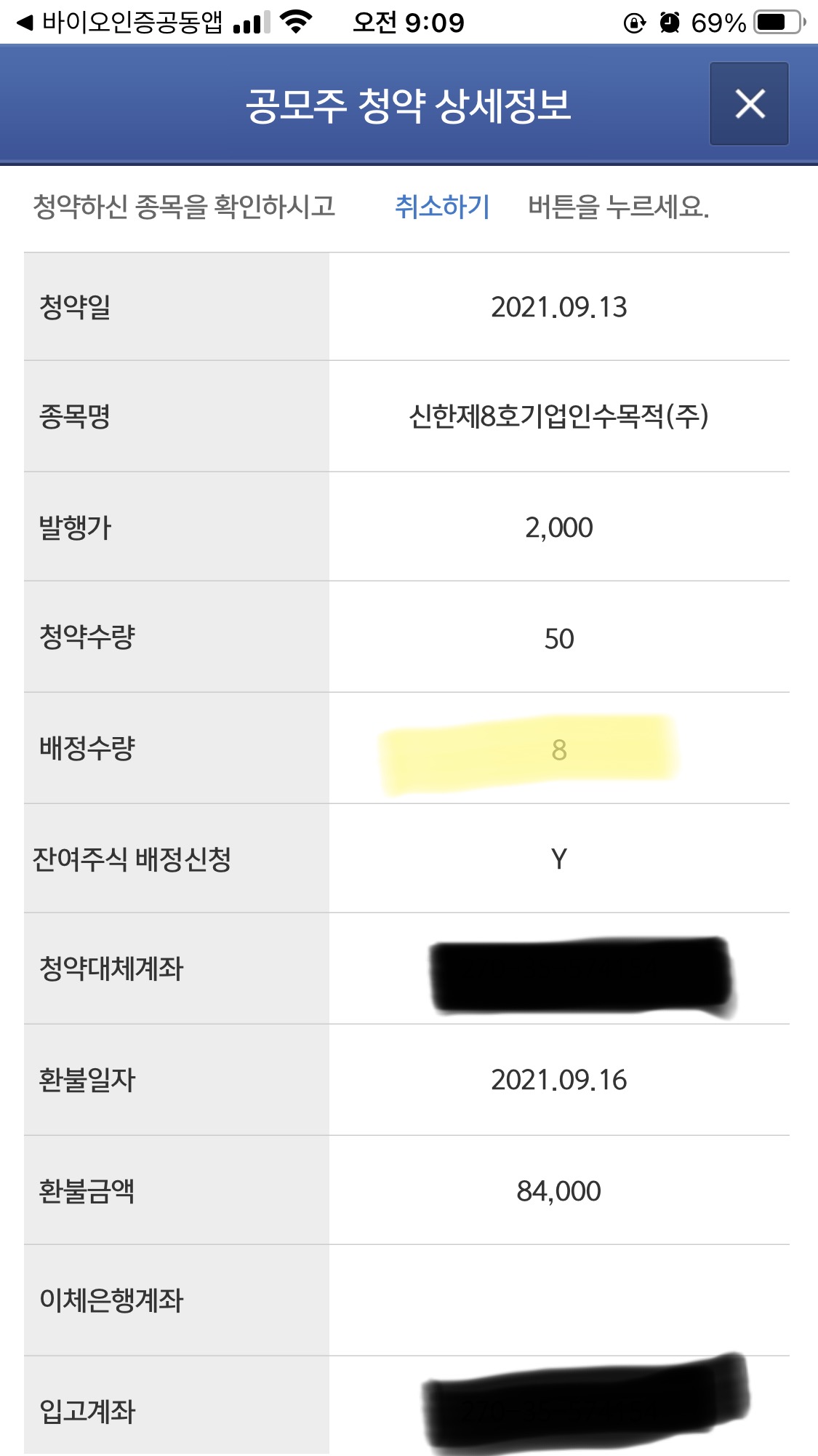 신한스팩 8호 공모주는 50주 청약했는데, 8주를 받았습니다.