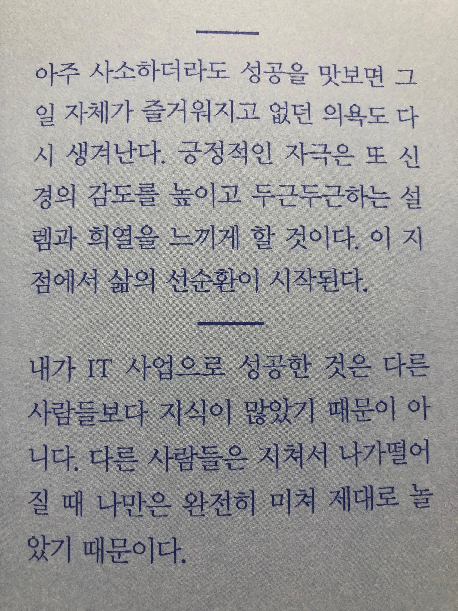 이 책을 다 읽고 내가 느낀 점이라면, 호리에 다카후미의 꿈과 삶에 대한 열정이 대단하는 점이다. 물론 저자는 결혼후에 얼마되지 않아 이혼했다. 그는 이런 말도 한다. ‘가족에 헌신, 안 할 수 있으면 하지 말라’란 말도 한다. 자신의 직업과 꿈에 대한 지독한 열정이 있기에 이런 말을 하는 것이다. 두 마리의 토끼를 자신은 다 잡으면 좋지만, 자신돈은 그러하지 못했다고 한다. 아마 저자가 돌씽이기 때문에 이야기 가능한 부분도 있고 한계도 분명히 있긴 있다.