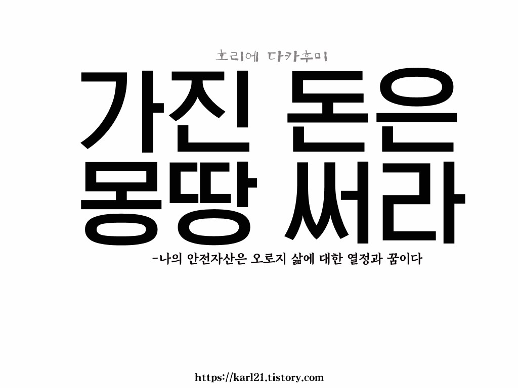 ‘돈은 소중하다. 그러나 쓰지 않으면 족쇄에 불과하다. 돈을 당장 내일도 알 수 없는 미래에 묵혀두지 말고 살아 숨쉬는 현재에 써라. 목표를 위해 쓰지 말고 목표를 없애 무엇에도 속박당하지않는 자유를 누려라! 가진 돈은 몽땅 써서 하고 하고 싶은 걸 하라!’