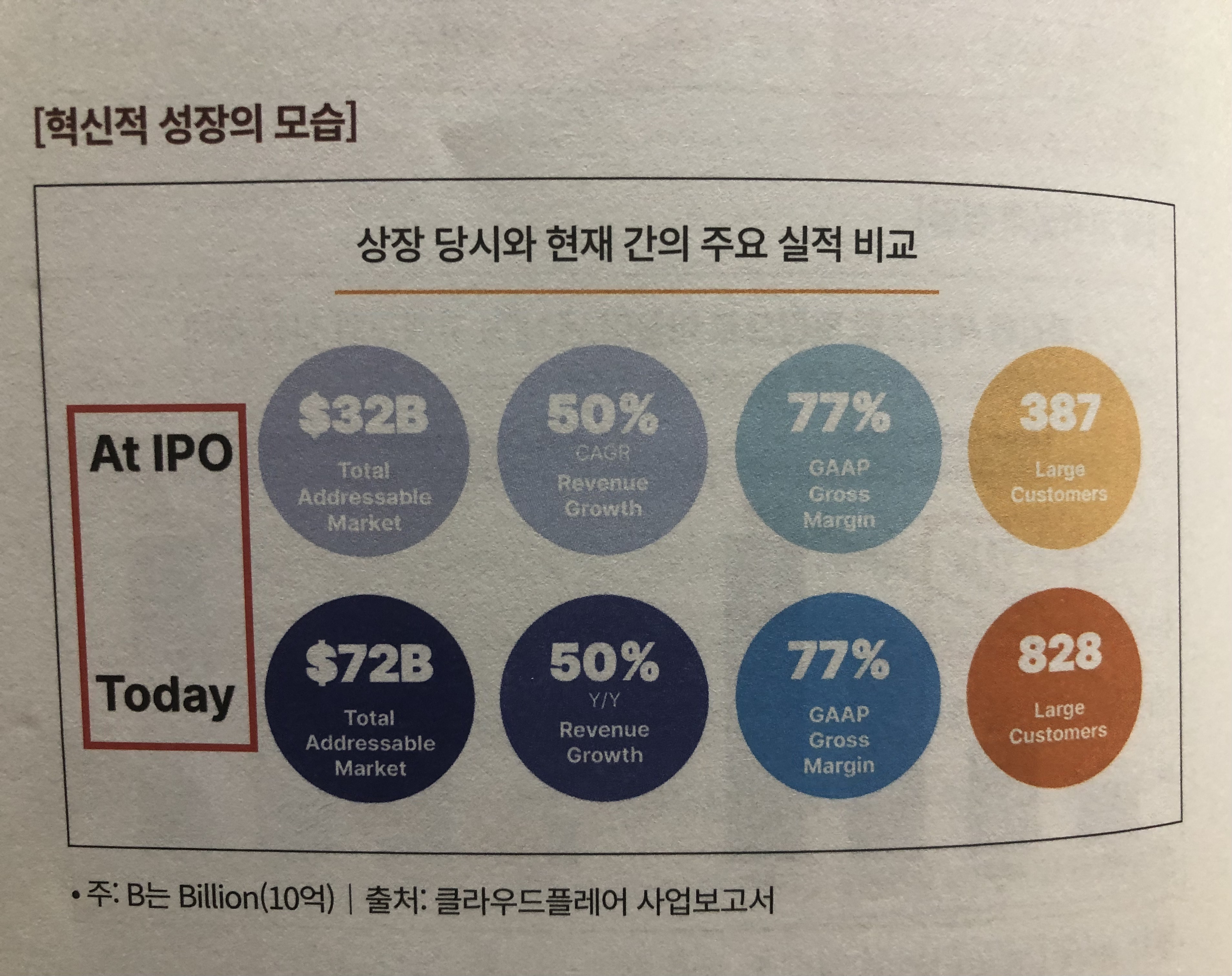위 그림은 2019년 9월 상장 때의 상황과 1년 반이 지난 2021년 초의 상황을 비교한 내용입니다. 이 1년 반이란 짧은 시간 동안 클라우드플레어의 잠재 시장 규모는 320억 달러(35조 2,000억 원)에서 720억 달러(79조 2,000억 원)으로