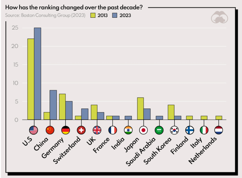 2023년에는 미국이 25개로 절반이상을 차지하면서 여전히 최정상급 존재감을 드러내주고 있습니다. 중국의 약진도 보이긴 하다.