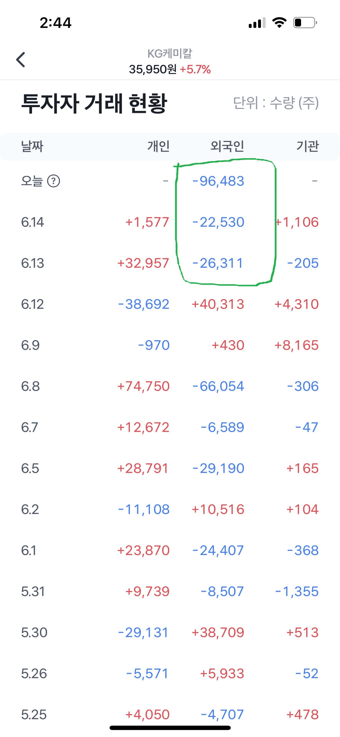 외국인은 이 주식을 팔고 있습니다. 3일 연속으로 KG케미칼을 팔고 있는데요. 개인은 사고, 외국인들은 팔고 있는 형국입니다.