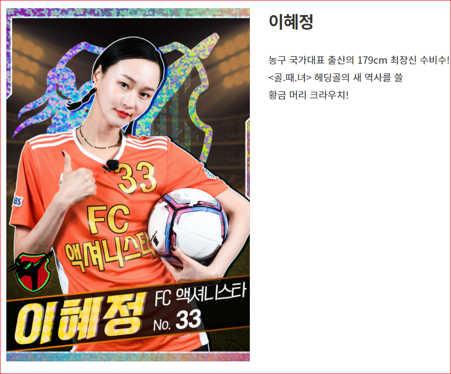 은 179cm의 최장신 수비수인데요, 농구선수 출신이다 보니 운동신경은 말할 것 없고 특히 헤딩으로 데뷔전에서 2골을 넣는 진기록을 남겼습니다. FC 액셔니스타가 실력면에서 엄청 수직상승중인데요, 거기에 이혜정이 +알파를 해주고 있네요. 헤딩골 넣었을 때 진짜 대박이었습니다!