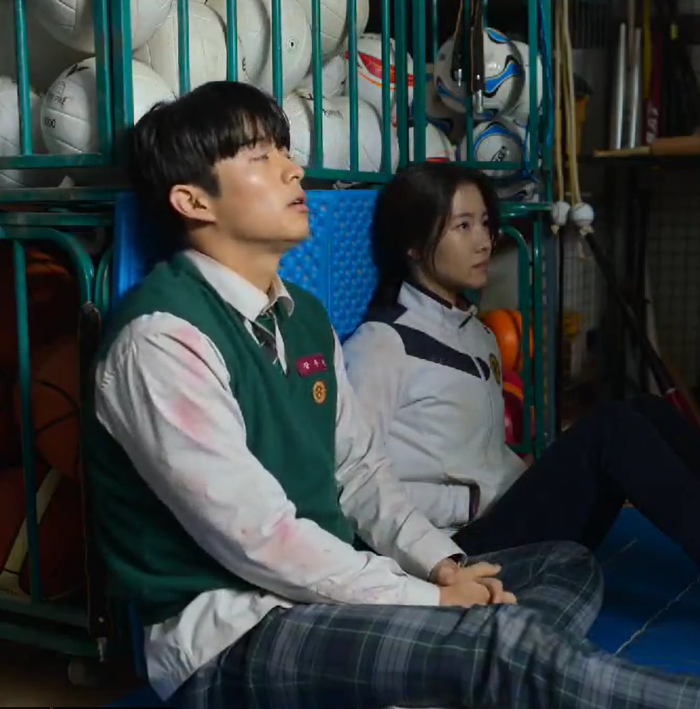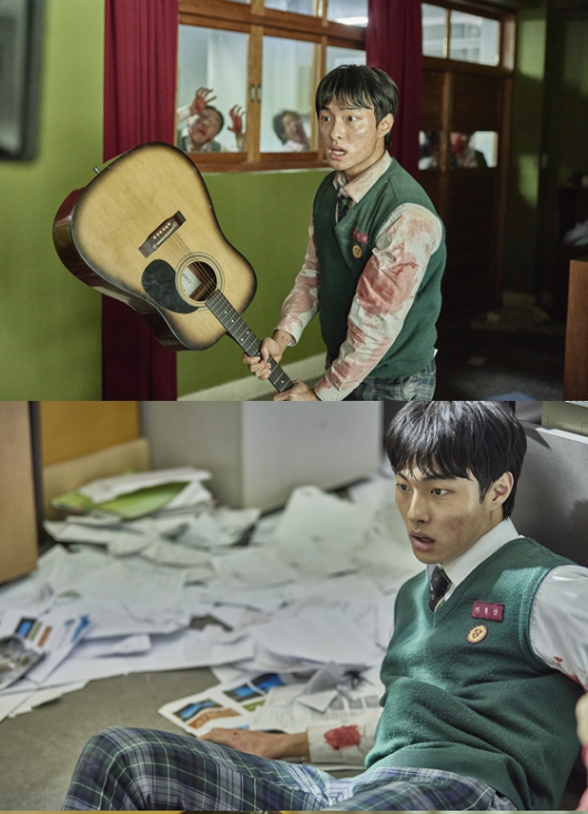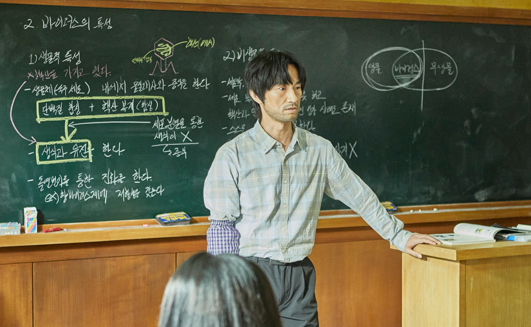 아시다싶이 <지금 우리 학교는>는 동시다발적인 스토리 덩어리가 여기저기가 현장감있게 전해주고 정신없이 이야기를 쏟아놓기 때문에 시청자들에겐 더 없는 몰입감을 전달해줍니다. 이것이 끝까지 스토리를 긴장감있게 가져갈 수 있는 원동력이 아닐까 싶은데요. 1화부터 끝까지 전달되는 tension을 전세계의 넷플릭스 팬들이 선사받았다고 해도 과언이 아니겠습니다. 효산고 애들 그룹 애이 주등장인물이지만, 가장 먼저 과학교사인 이병찬을 빼놓을 순 없겠죠.
