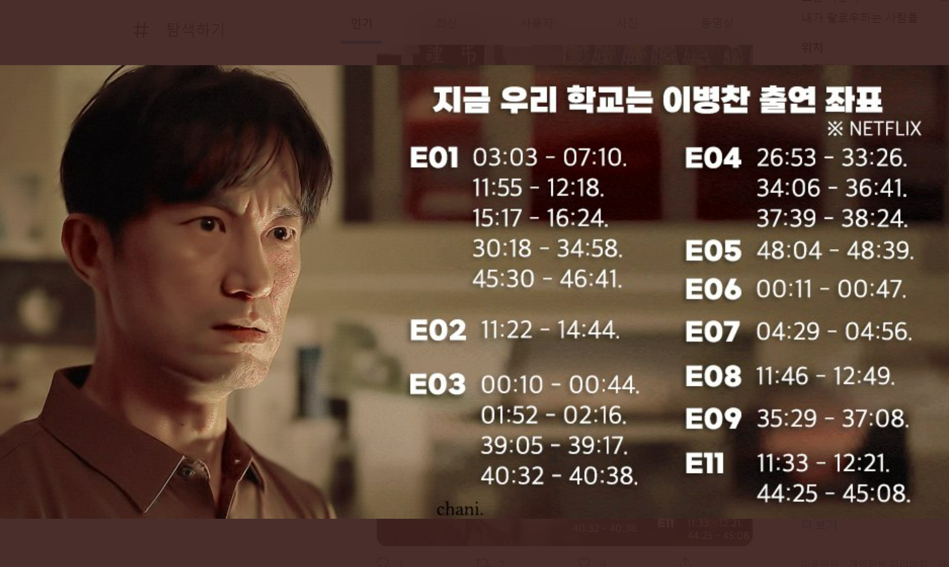 바이러스의 유포자답게 골고루 출연한 이병찬 과학교사의 출연좌표를 넷플릭스 트위터에서 소개해주고 있다(아래 사진 참조). 너무 웃긴다.
