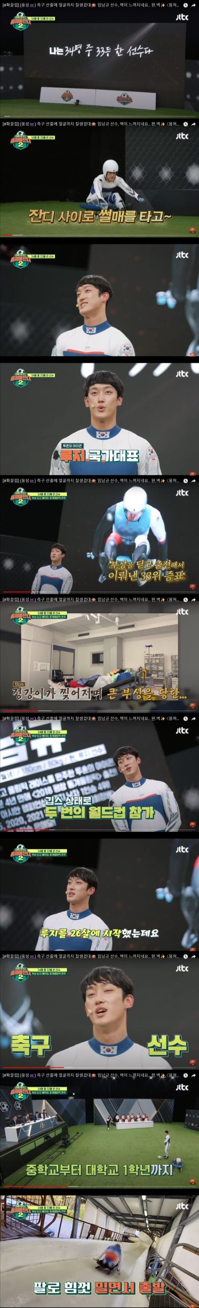 임남규 선수는 볼 트래핑, 헤딩, 양발로 강력한 슛팅이 가능하고, 돌파할 때 호나우딩요가 했던 상대방을 농락하는 레인보우 플릭까지 장착된, 기술이 대단한 선수입니다. 역시 선수 출신이 다르긴 다릅니다. 이렇게 축구를 잘하는 친구가 대학 1년 때까지 축구를 하다가 그만둔 데에는 사연이 있었는데요. 고등학교 때 부친의 사업이 기울어져가다가 대학교 1년 때 부친이 사망하면서 더 이상 축구를 할 경제적인 지원이 힘들었기 때문입니다. 그리고서 그는 축구선수로서의 꿈을 접고 군대를 입대한 후에 26살에 루지 선수로 거듭난 것인데요.